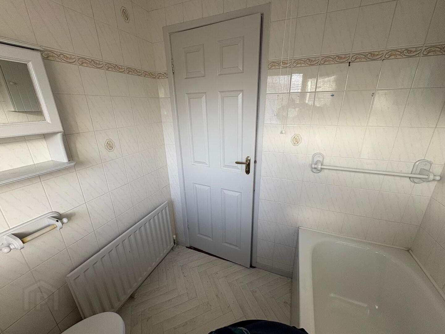 White suite incorporating WC, WHB and bath with electric shower oveR, fully tiled walls, single radiator and vinyl to floor.