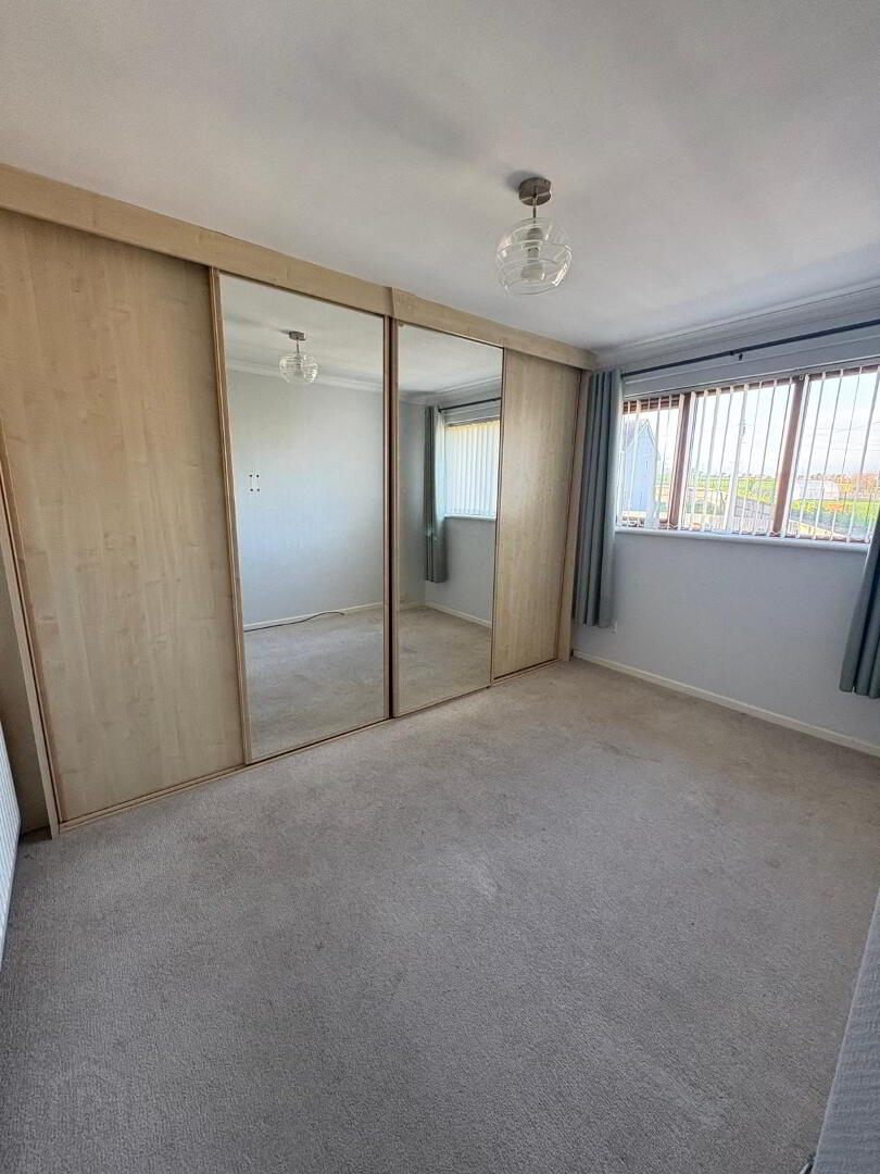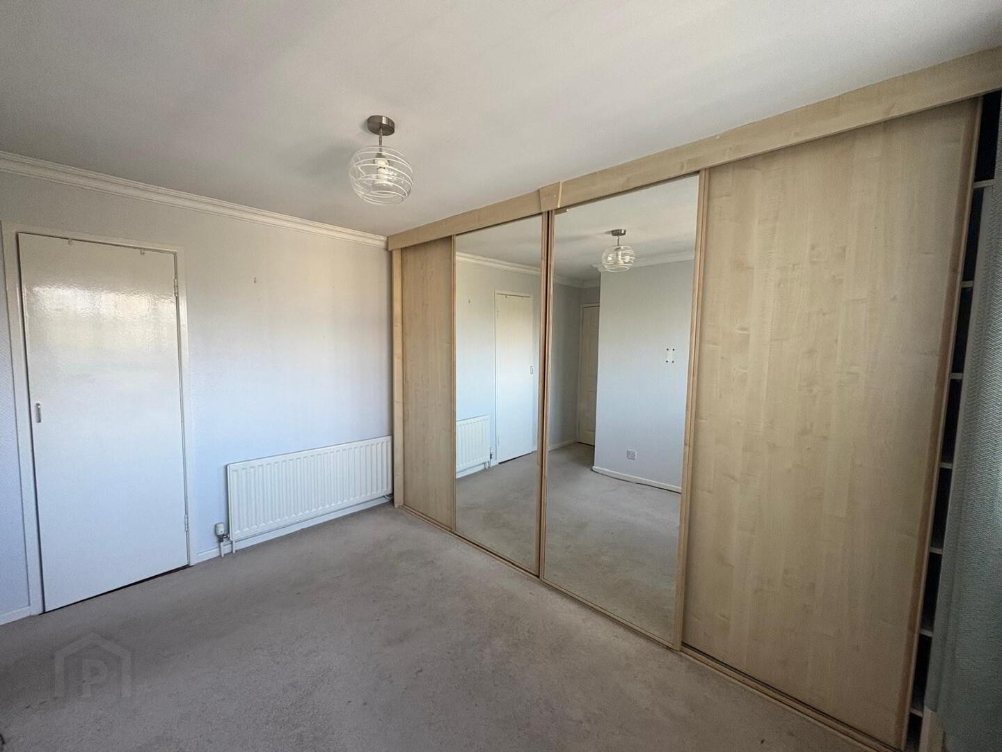 Double room with carpet to floor, two single power points, single radiator, single fitted wardrobe plus wall to wall fitted slide robes with hanging, shelving and drawers.