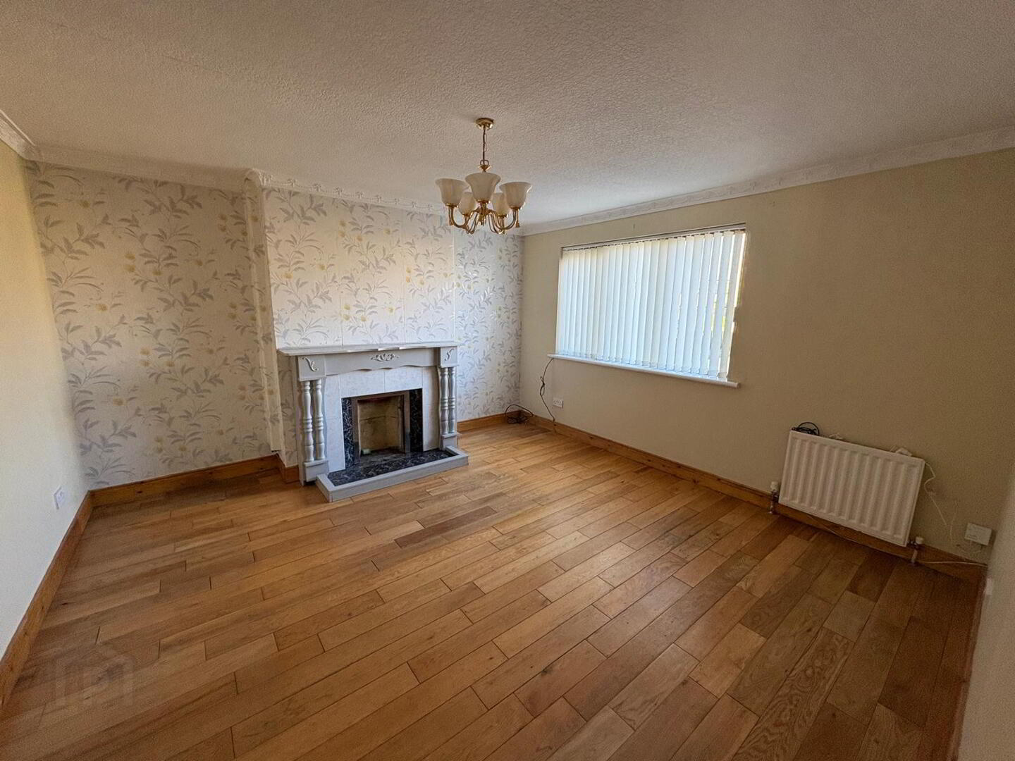 Floored through from hallway, feature surround In wood with tiled Inset (open fire available) three double power points, TV outlet and decorative coving to ceiling.