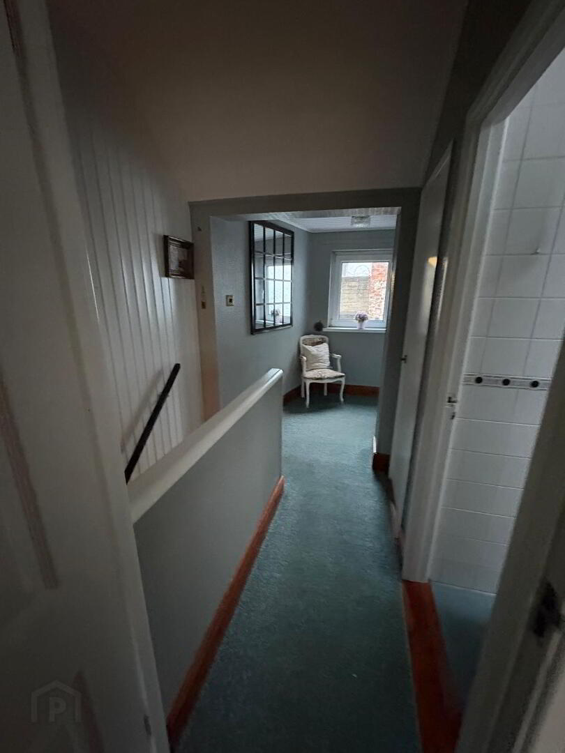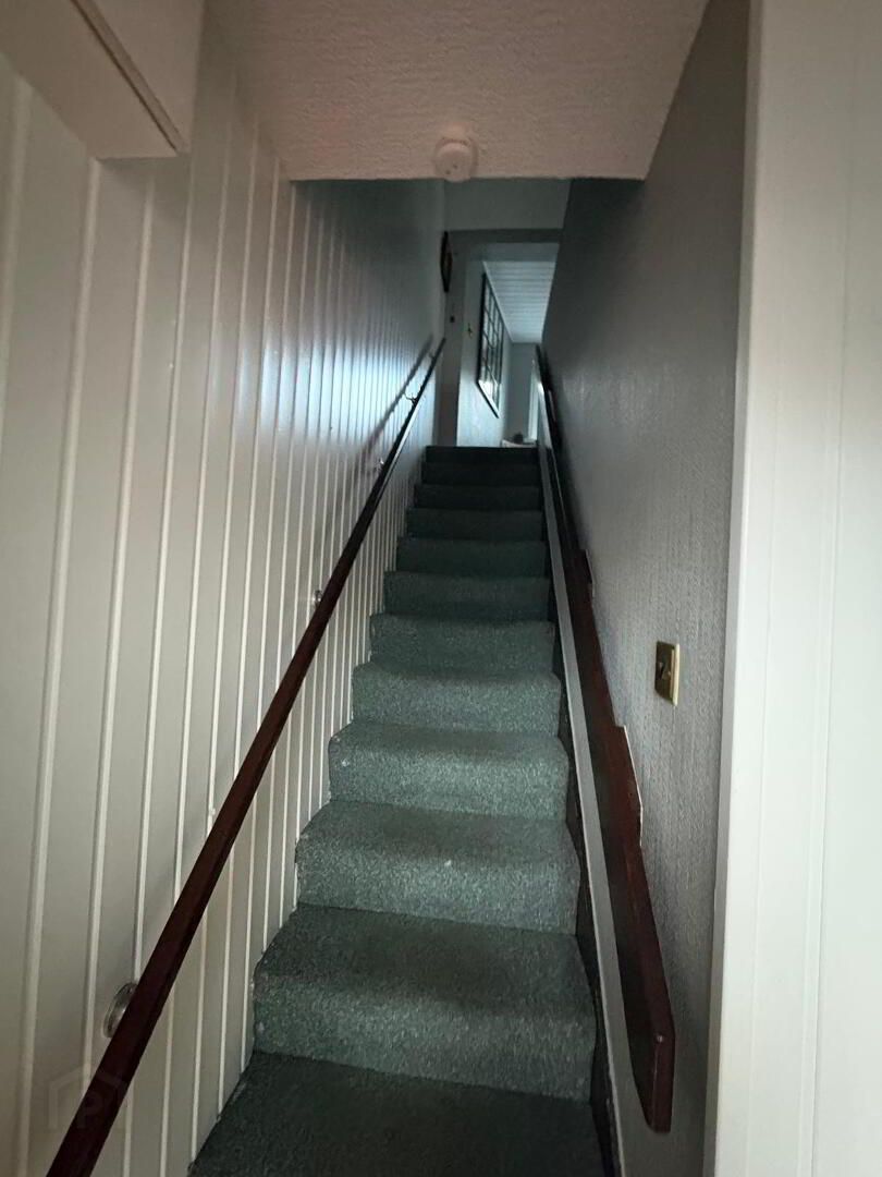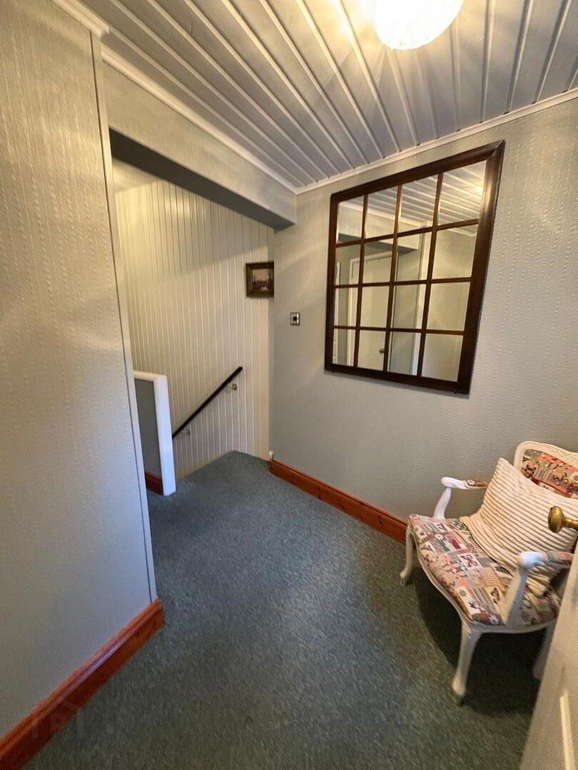 Carpeted floor and stairwell, partially wooden panelling to walls, access to airing cupboard.