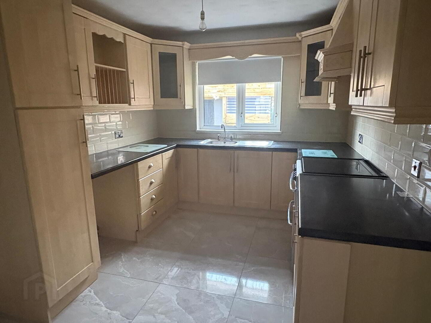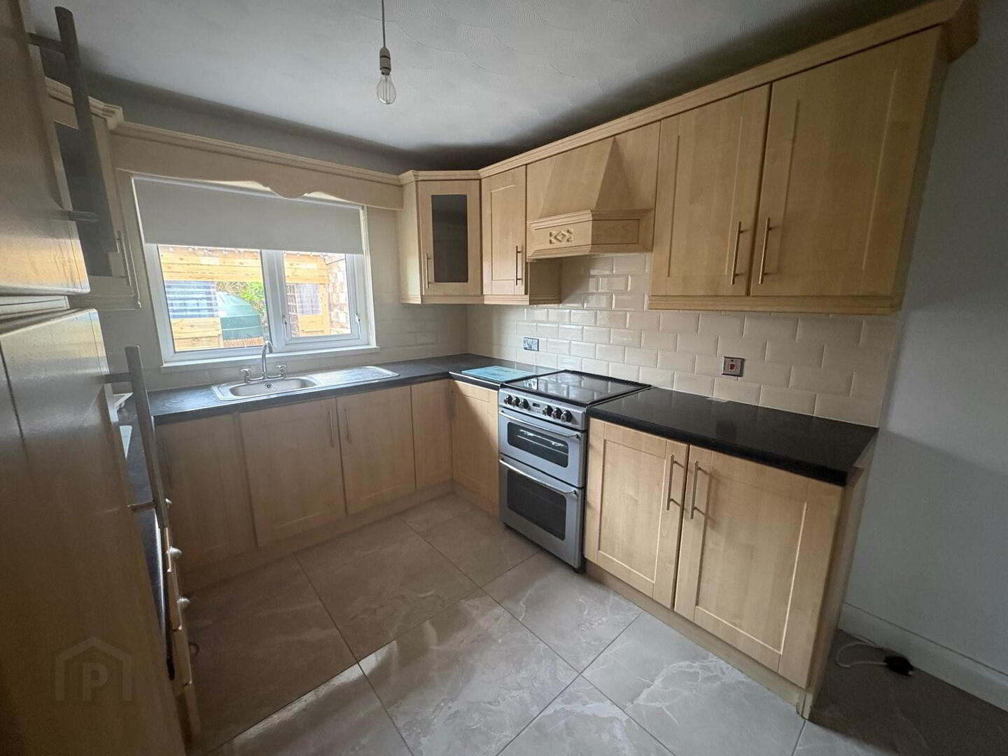 Fully fitted shaker style kitchen including display unit and larder, freestanding double oven with hob, extractor fan over single bowl stainless steel sink with mixer tap and drainer, two double/one Single power points plus appliance points. single radiator one double PowerPoint to dining area. This area in finished with a high gloss ceramic tile to floor and modern subway tiles between upper and lower level units.