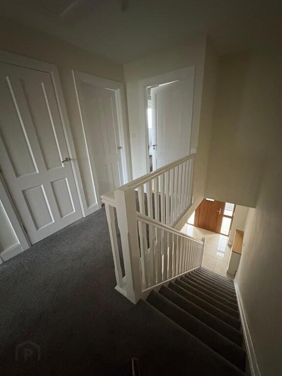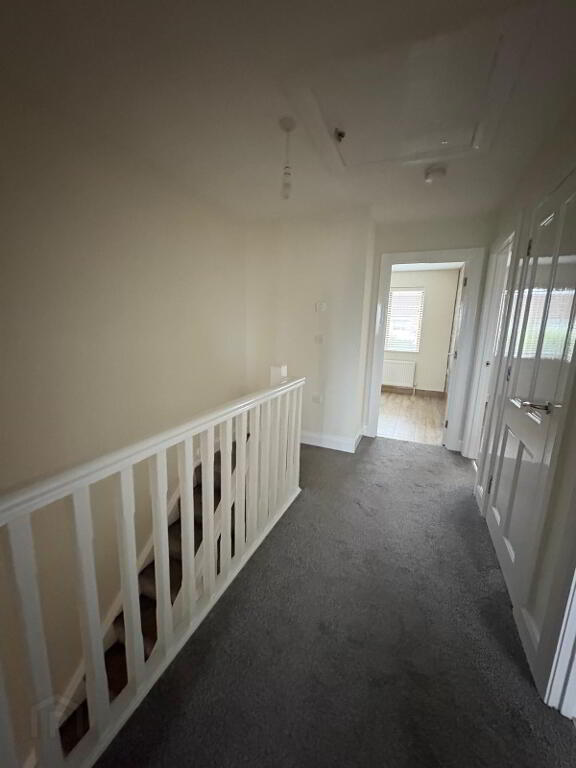 Carpet to floor and stairwell, access to shelved airing cupboard, access to attic with pull down ladder, one singe power outlet and heating thermostat.