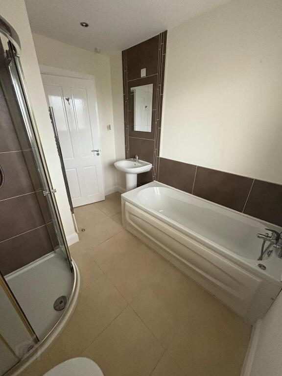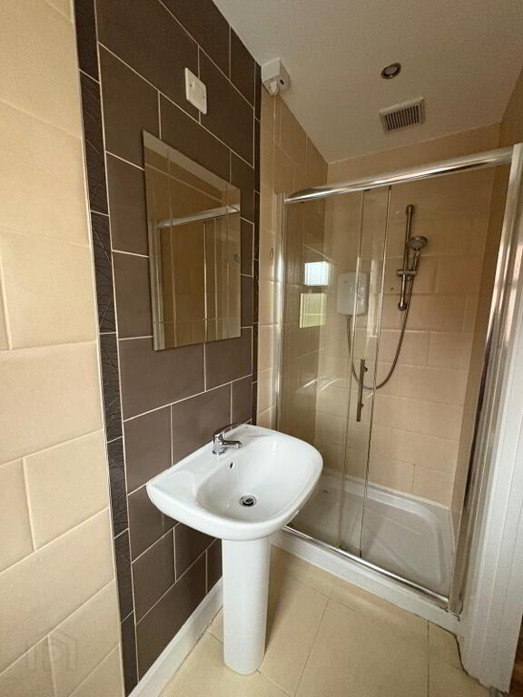 Exceptional finish with WC, WHB and walk-in shower (electric) (900 x 1100) Fully tiled to wall with decorative floor to ceiling panel and extractor fan.