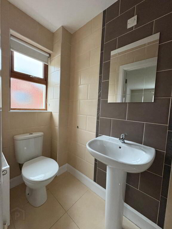 White suite with WC and WHB, tiled through from hallway, tiled splash back, radiator and extractor fan.