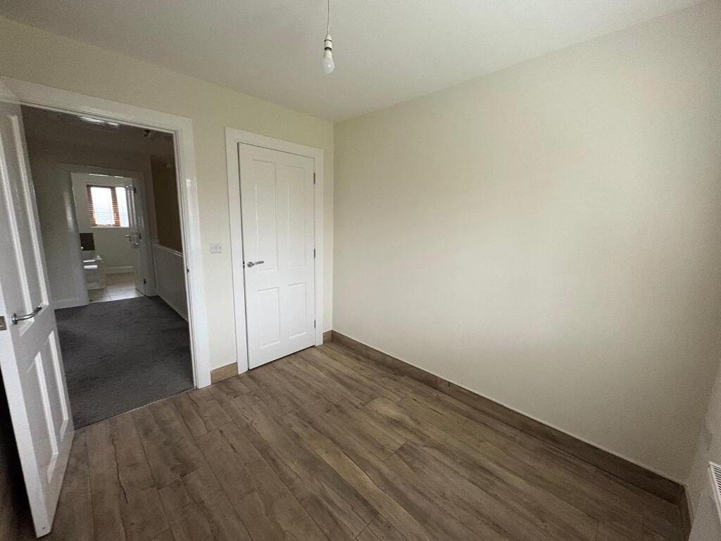 Single room with modern click-board flooring with matching feature wall and upturn, single fitted wardrobe, radiator plus two double power points.