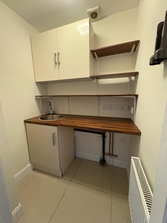Fitted with upper and lower-level units and shelving plus single bowl sink with mixer tap over, single radiator, plumbed for washing machine, one double power point plus appliance point, heating control panel, extractor fan and polished porcelain tiling to floor.