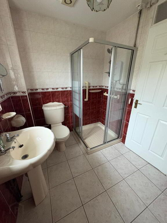 WC and WHB with walk-in shower cubicle(electric) extractor fan, fully tiled walls, ceramic tile to floor and single radiator.