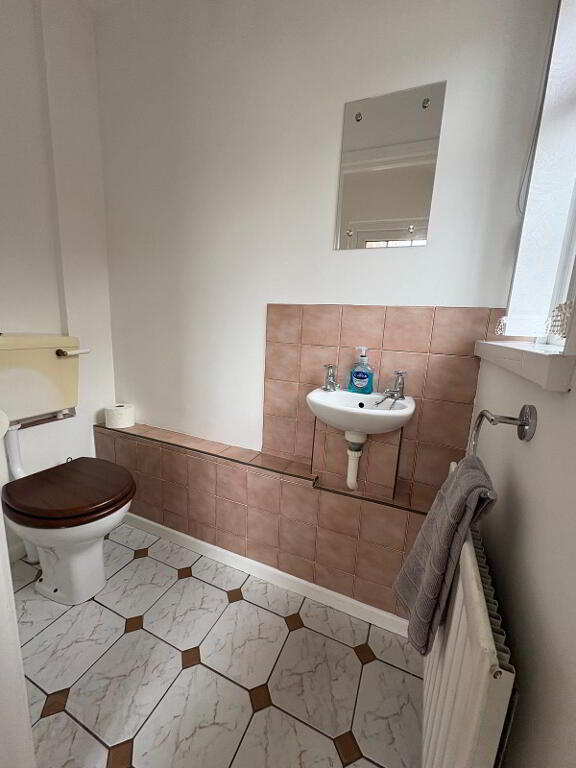 White suite with vinyl to floor and partially tiled walls plus single radiator.