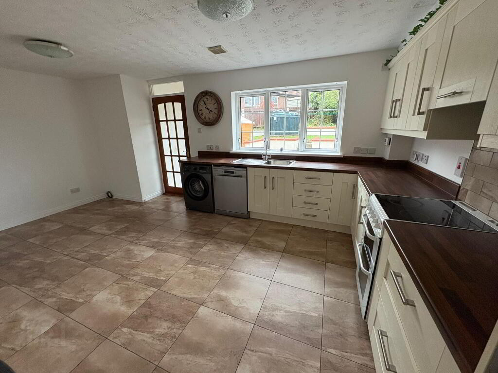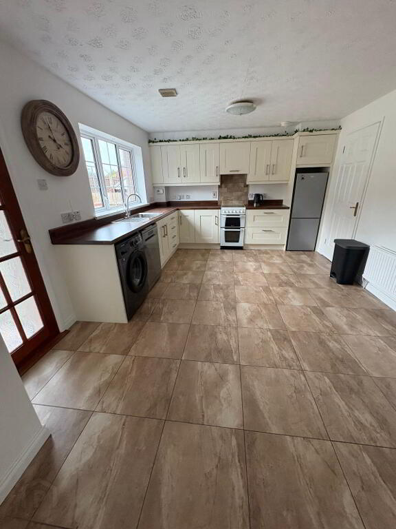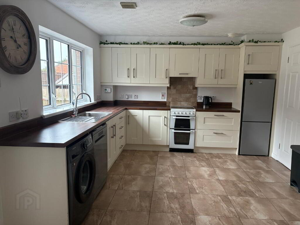Fully fitted modern kitchen with upper/lower-level units finsished wooden effect worktop plus upturn, freestanding fridge and cooker (extractor fan over) , plumbed for washing machine and dishwasher. Single bowl stainless steel sink with drainer and mixer tap over, four double power points plus appliance points and walk-in storage unit (1.086 x 2.659) and completed with ceramic tile to floor.