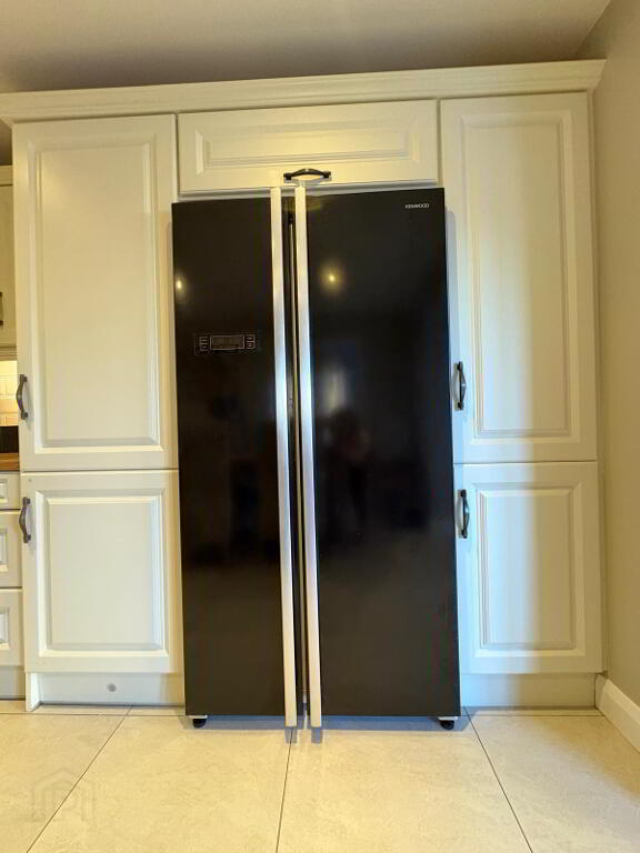 Lush finish with an amazing modern kitchen incorporating flexible island, freestanding Belling stove with double oven (electric) with extractor fan over, integral dishwasher, American fridge/freezer, double bowl stainless steel sink unit with drainer and mixer tap. Tiled through from hallway, subway tile finish between units, Spotlights to ceiling, five double power points plus appliance points, TV outlet and double radiator.
