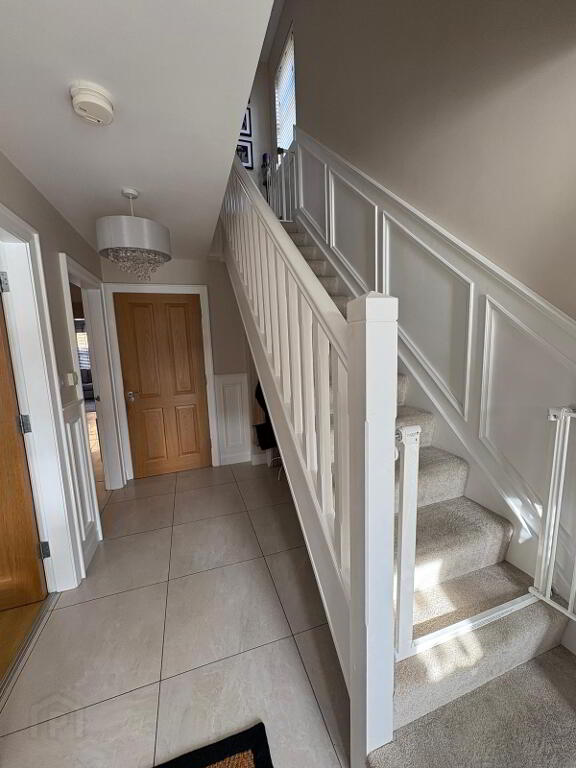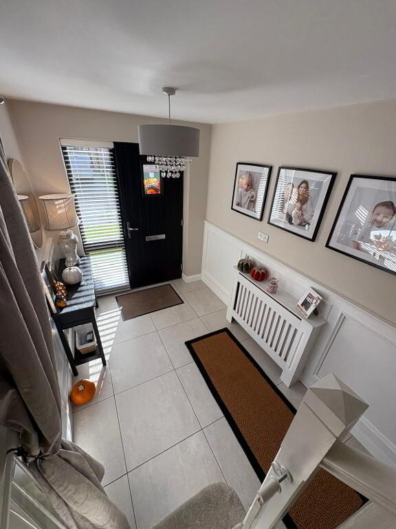 Inviting access with ceramic tile to floor, modern wooden panelling to walls and stairwell, radiator with decorative cover, mains operated smoke alarm, broadband box (BT PROVIDER) plus one double power points.