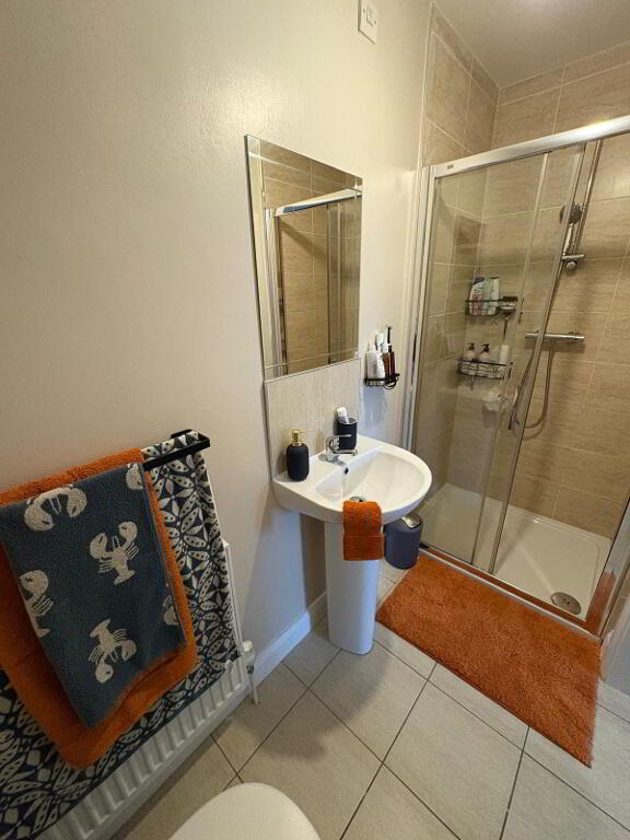 White suite with WC, WHB with modern LED mirrored light over, double ended, bath with mixer tap, shower cubicle with mains operated shower. Ceramic tile to floor, partially tiled walls, single radiator plus extractor fan.