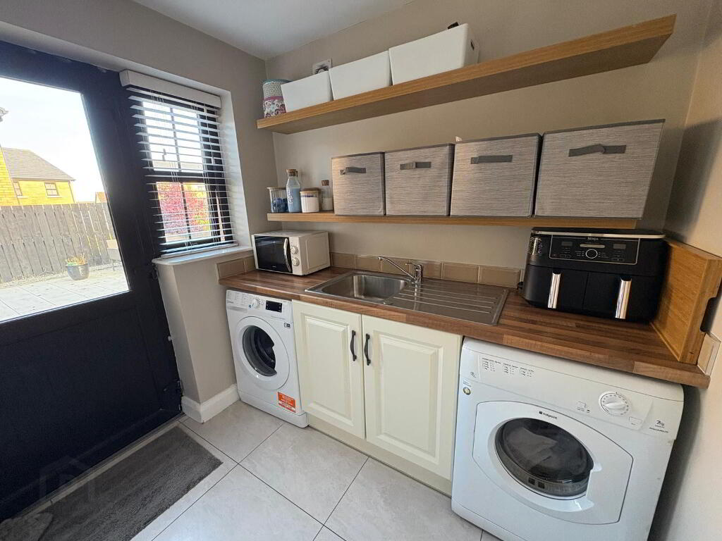 Fitted with lower-level units plus modern shelving, stainless steel sink unit with drainer and mixer tap, plumbed for washing machine, vented for dryer, two double power points plus appliance points extractor fan, tiled through from kitchen, upturn to worktop plus Single radiator.