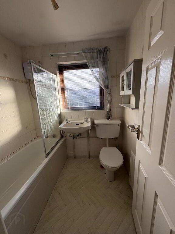 White suite incorporating WC, WHB and bath with electric shower oveR, fully tiled walls, single radiator and vinyl to floor.