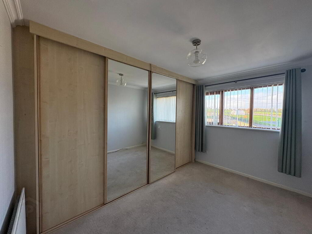 Double room with carpet to floor, two single power points, single radiator, single fitted wardrobe plus wall to wall fitted slide robes with hanging, shelving and drawers.