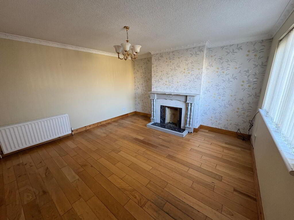 Floored through from hallway, feature surround In wood with tiled Inset (open fire available) three double power points, TV outlet and decorative coving to ceiling.