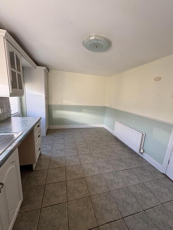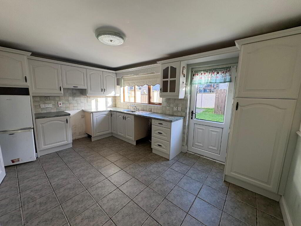 Fitted kitchen with upper and lower-level units plus shelved larder and extractor fan, stainless steel sink with drainer, double radiator and three double power points. Tiled between units, dado rail to walls and ceramic tiled floor.