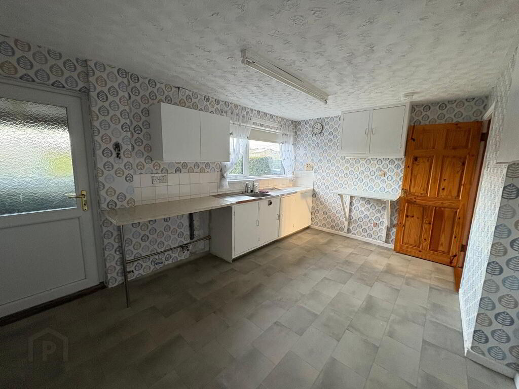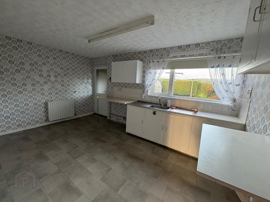 Fitted with upper and lower-level units with stainless steel sink unit with double drainer. Three single power points, double radiator and vinyl to floor.