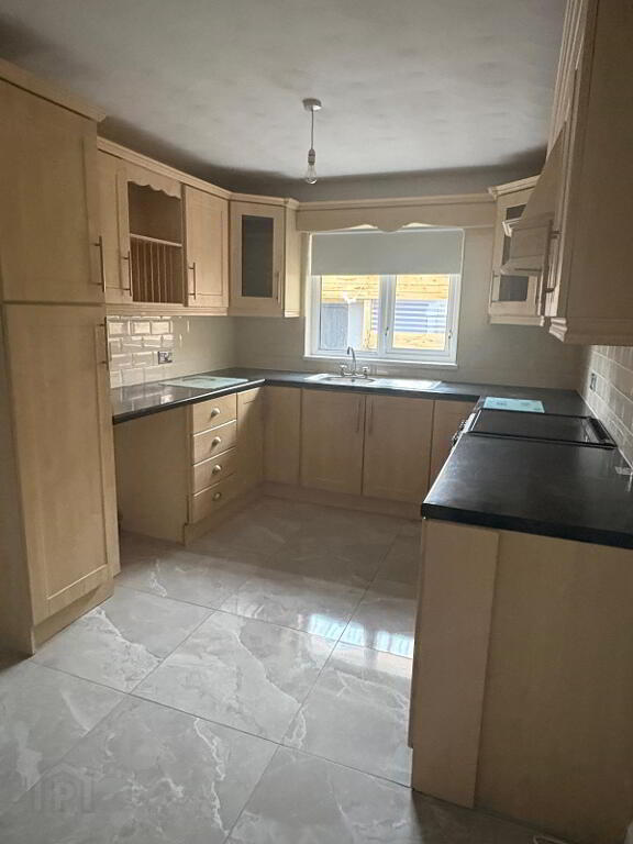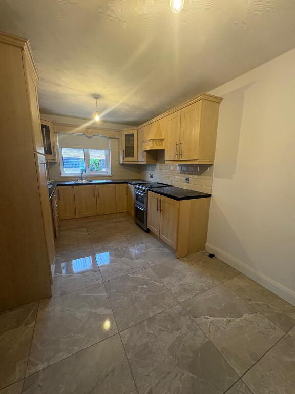 Fully fitted shaker style kitchen including display unit and larder, freestanding double oven with hob, extractor fan over single bowl stainless steel sink with mixer tap and drainer, two double/one Single power points plus appliance points. single radiator one double PowerPoint to dining area. This area in finished with a high gloss ceramic tile to floor and modern subway tiles between upper and lower level units.